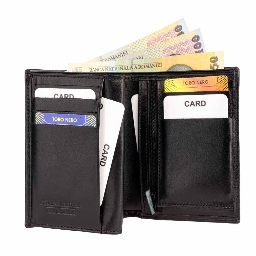 Acest portofel este confecționat din piele naturală de înaltă calitate, asigurându-i durabilitate și rezistență în timp. Culoarea neagră îi conferă un aspect atemporal și versatil, potrivindu-se cu ușurință oricărei ținute.