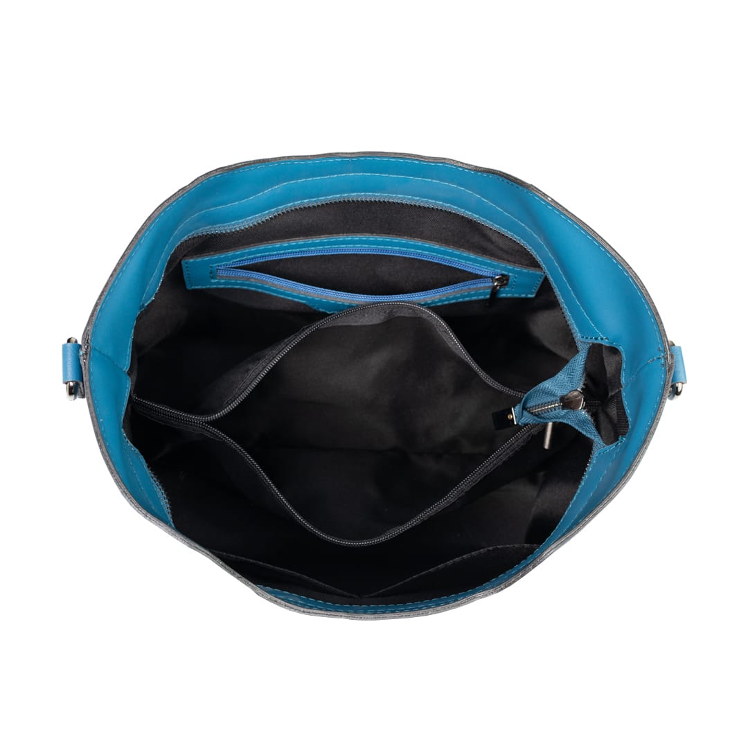 Cu această poșetă TORO NERO din piele naturală nu trebuie să îți faci griji că vei rămâne fără spațiu pentru cele mai importante lucruri din viața ta. Acest fapt se datorează compartimentelor generoase ale modelului Design Lover albastru petrol.